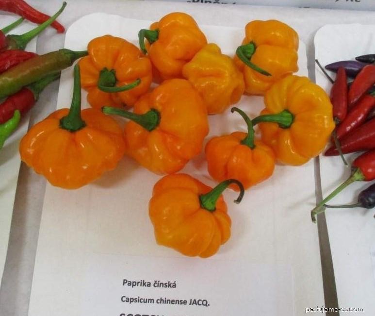 Paprika čínská 'Scotch Brains Yellow' - Capsicum chinenseCapsicum chinense 'Scotch Brains Yellow'; Čeleď: Solanaceae - lilkovité Rostlina dorůstá do výšky až okolo 150 cm. Plody jsou robustní a balonkovité a směrem ke špičce se zužují. Povrch plodů je velmi krabatý. Zpočátku jsou plody zelené, později se mění do žluto oranžové barvy. SHU se pohybuje od 600.000 - 800.000. | |||